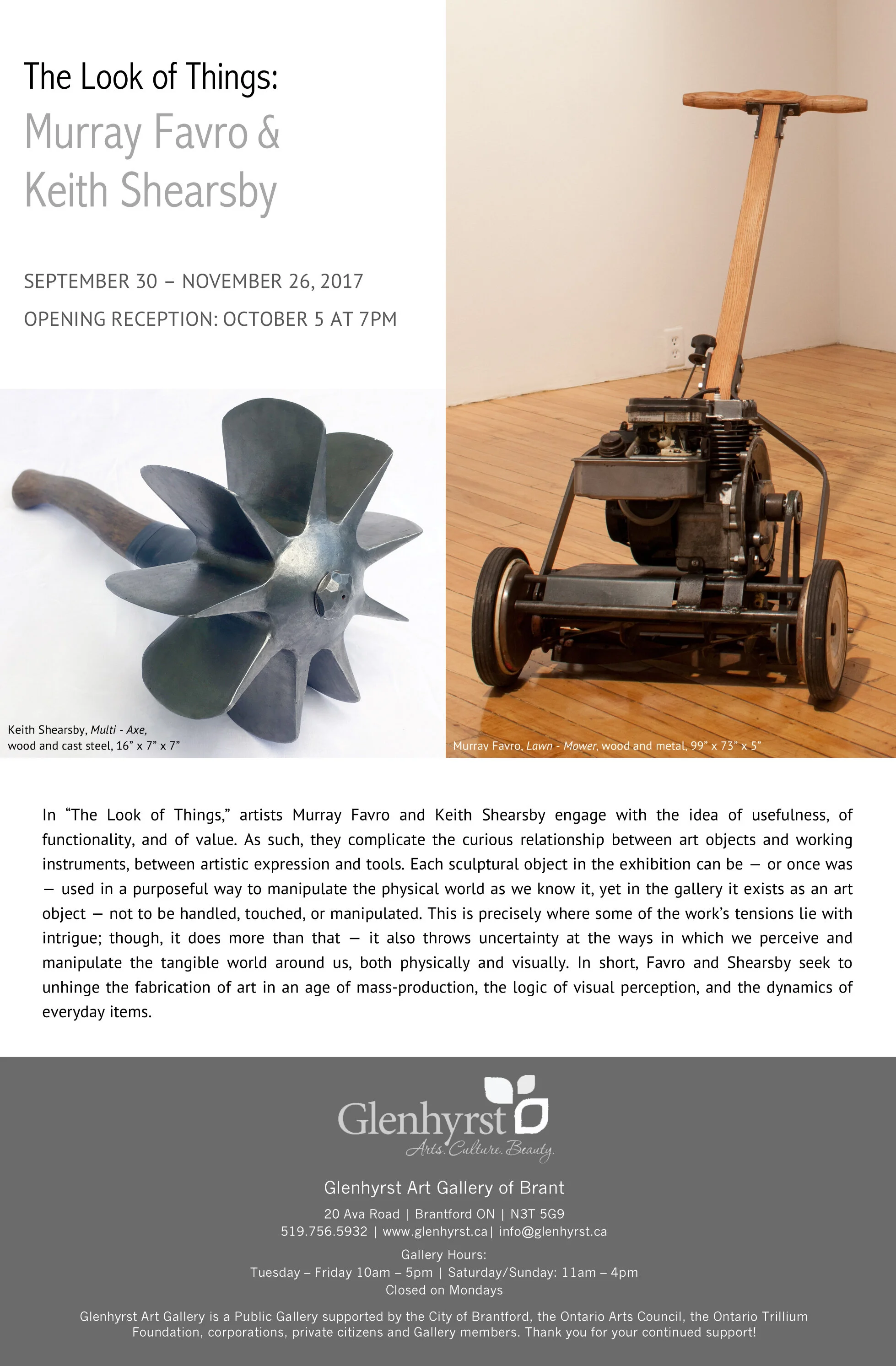 In “The Look of Things,” artists Murray Favro and Keith Shearsby engage with the idea of usefulness, of functionality, and of value. As such, they complicate the curious relationship between art objects and working instruments, between artistic expression and tools. Each sculptural object in the exhibition can be—or once was—used in a purposeful way to manipulate the physical world as we know it, yet in the gallery it exists as an art object—not to be handled, touched, or manipulated. This is precisely where some of the work’s tensions lie and intrigue; though, it does more than that—it also throws uncertainly at the ways in which we perceive and manipulate the tangible world around us, both physically and visually. In short, Favro and Shearsby seek to unhinge the fabrication of art in an age of mass-production, the logic of visual perception, and the dynamics of everyday items.