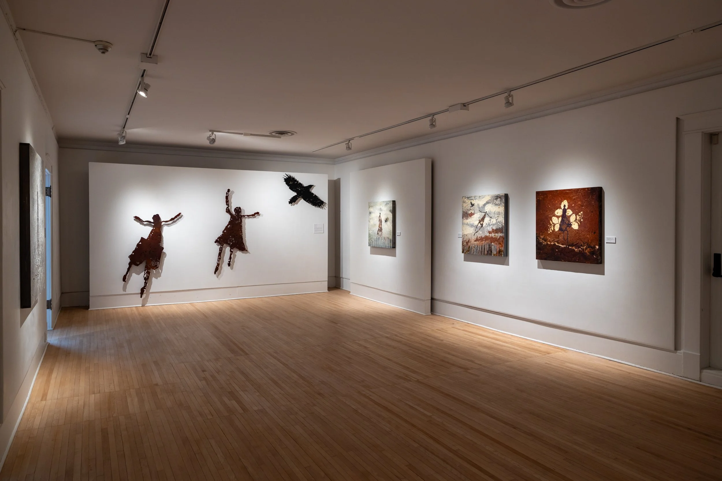 This exhibition features the work of Simcoe-based Indigenous artist Michael Barber. Using a range of media and techniques, Barber scratches, cuts, and gouges the surfaces of his paintings. These marred and distressed textures function as metaphors for the ways that history is denied, misrepresented, or left unspoken. Barber’s recent work applies this idea to his family’s survival of the Mohawk Institute in Brantford, the largest and longest-running Residential School in Canada. The paintings confront the impact of the Institute, the enduring effects of intergenerational trauma, and the cultural disconnection it produced within Haudenosaunee communities. They are not precious objects but contested sites, at once harrowing, loving, antagonistic, beautiful, and disarming. His vivid imagery of ravens delivers messages to loved ones in the afterlife, seeking their wisdom and guidance, while strawberries symbolize their love and support. Balancing dark realities with hope for the future, The Messengers is ultimately a story of renewal.