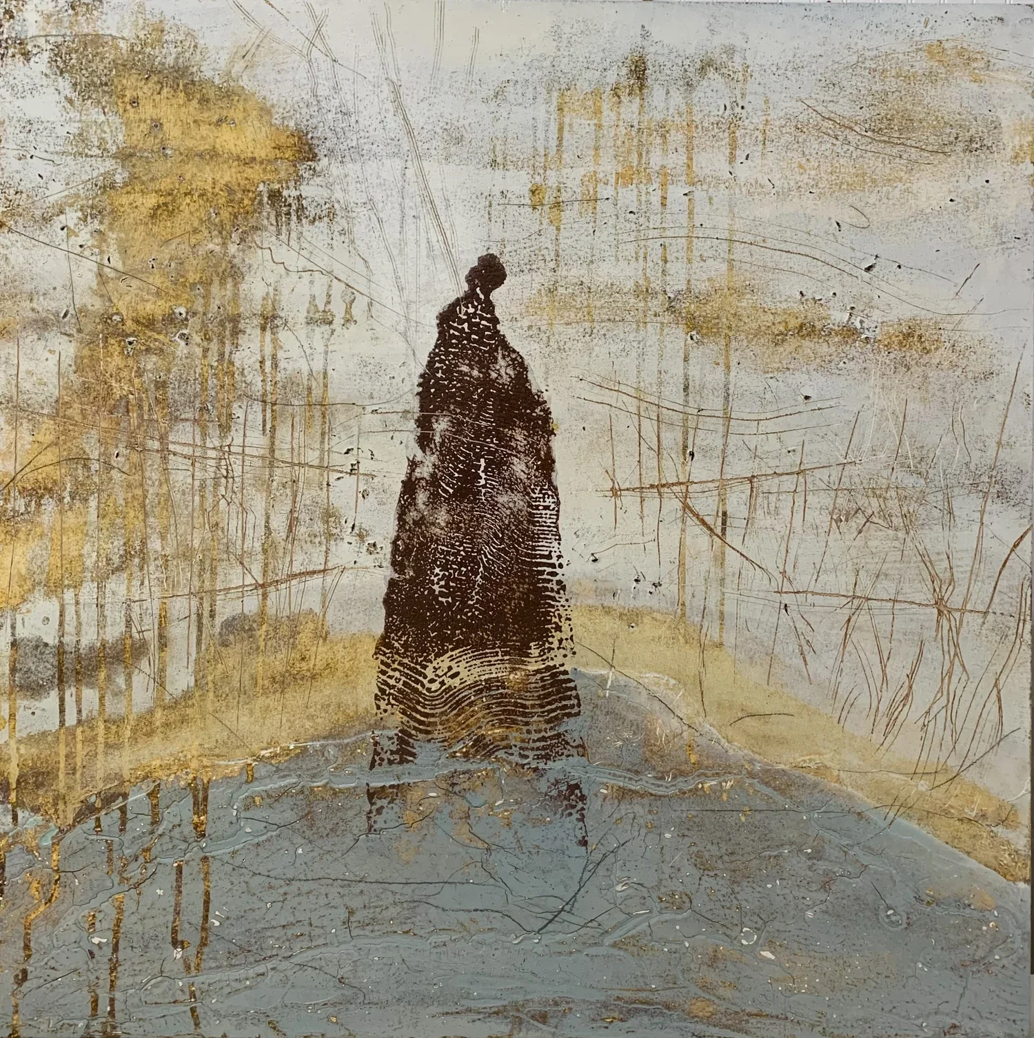 Michael Barber is an Indigenous artist (Upper Mohawk) from Port Dover, Ontario. His mixed media compositions are alluring and intriguing. Thick, chipped, scratched and blistered layers of pigment create marvelous worn textures, which have splashes of resin that add to their appeal. Barber paints on mahogany plywood and uses a variety of methods in his work. He uses resist techniques for paint application and gouging and scratching is done with many different types of hand tools. Exposing earlier layers in his work through this practice helps him to create a sense of time. Barber applies images to the work using a primitive printing technique and manipulating the cut after various applications.